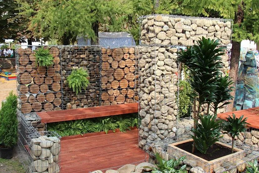 - Габионы из сетки в ландшафтном дизайне эффективно используются для зонирования территории. С помощью таких конструкций можно, например, выделить зону отдыха или детскую площадку. Причём даже для создания высоких и крупных построек не нужно задействовать специализированную строительную технику, а можно быстро и просто выполнить всё своими руками.