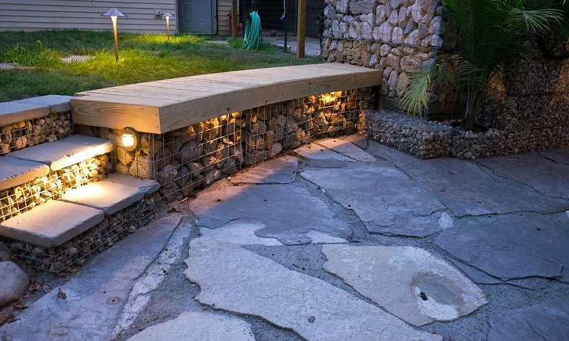 - Светильники. Светодиодная лента, помещенная в коробочные или матрасные габионы, украшает и освещает территорию, выделяет зоны для отдыха, занятия спортом.