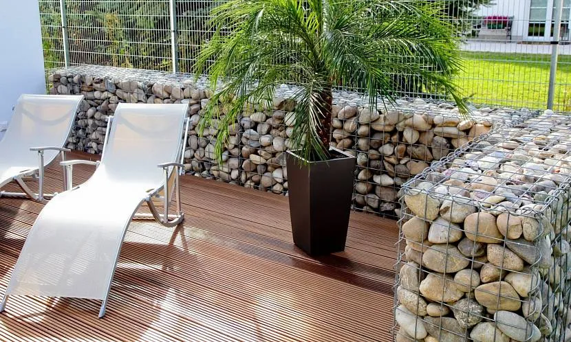 - Террасы. На крутом террасном склоне можно установить площадку для отдыха и сбора гостей, укрепив ее основание габионной конструкцией. В зависимости от архитектурного решения, габионы могут одновременно быть подиумом и лестничным проемом для спуска с уклона.