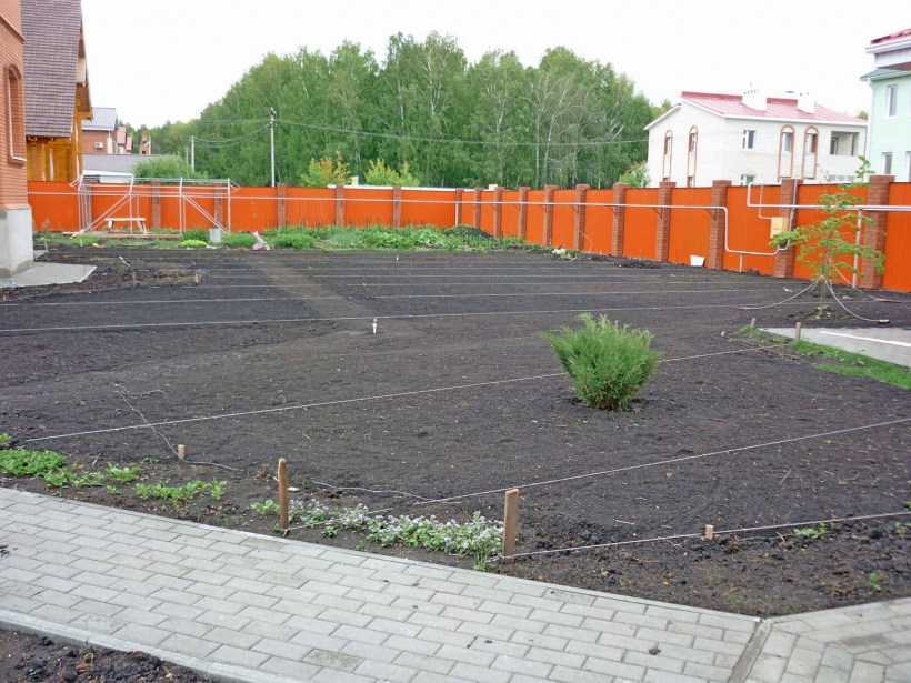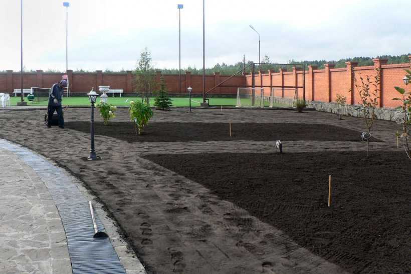 Прежде чем начнется посадка газона своими руками, убирается плодородный слой почвы, затем засыпается гравием и утрамбовывается. Следующим слоем идет песок. Поверх кладут тот слой плодородной почвы, который сняли первым