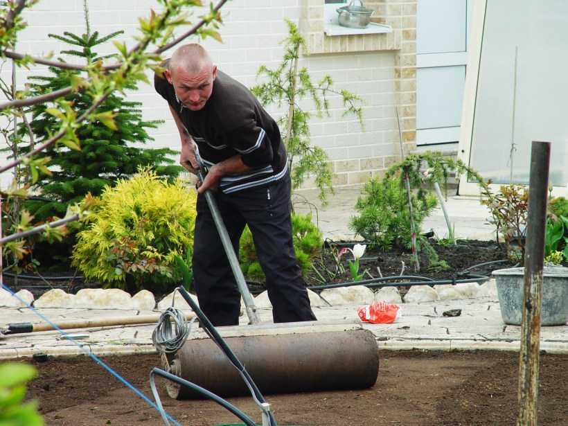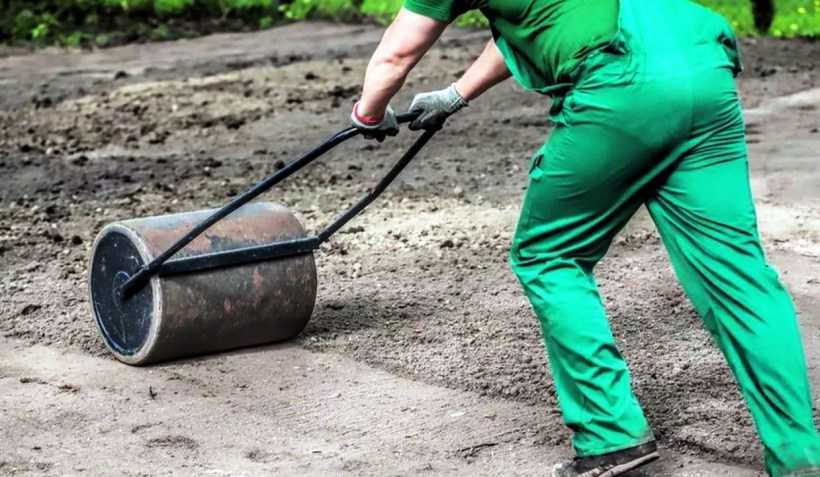 - Утрамбовка. Чтобы на площадке под газон к весне не образовались разного вида неровности, а почва после дождей не превратилась в болото, ее утрамбовывают специальным катком, бревном или с помощью обычной доски.