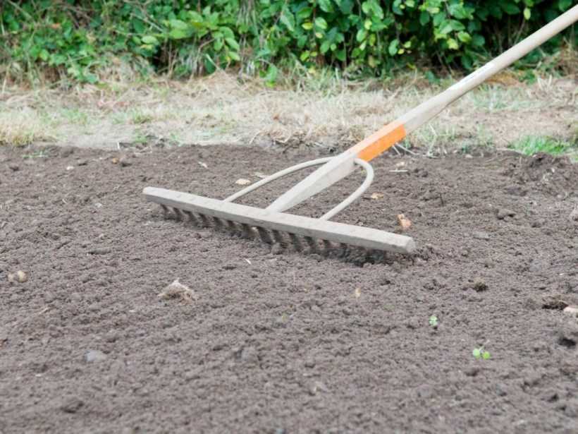 Поверхность почвы слегка взрыхляем граблями. Лучше всего воспользоваться веерными. На земле должны остаться неглубокие бороздки.