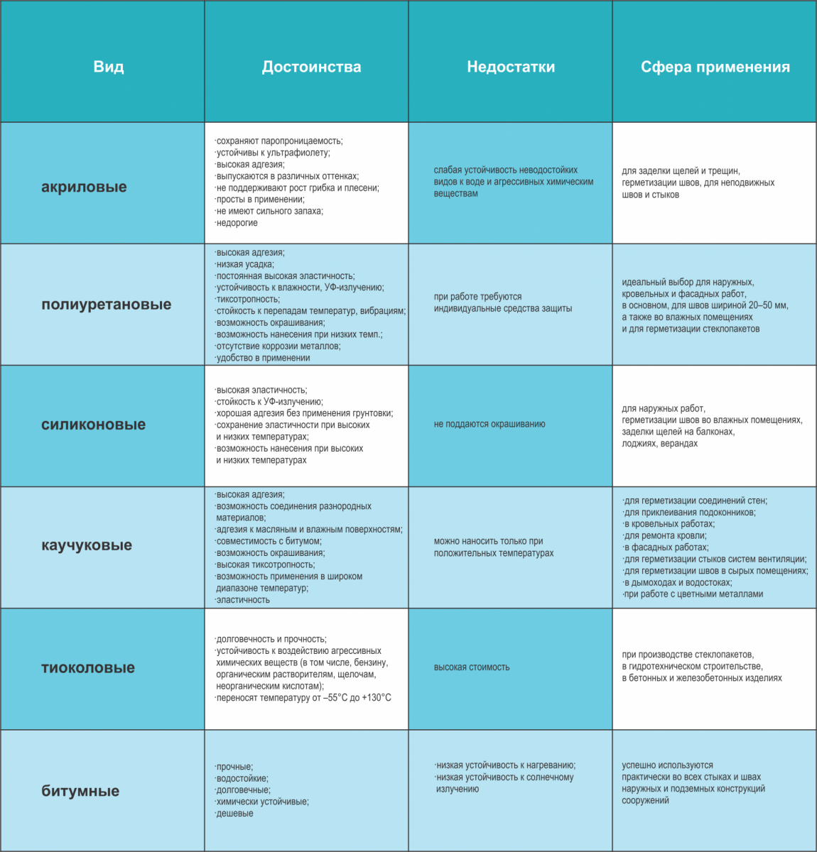 - По компонентной формуле выделяются смеси для межпанельных швов и стыков для внутренних работ, с повышенной гибкостью, тиоколовые материалы. Каждый из материалов имеет свои свойства, характеристики.