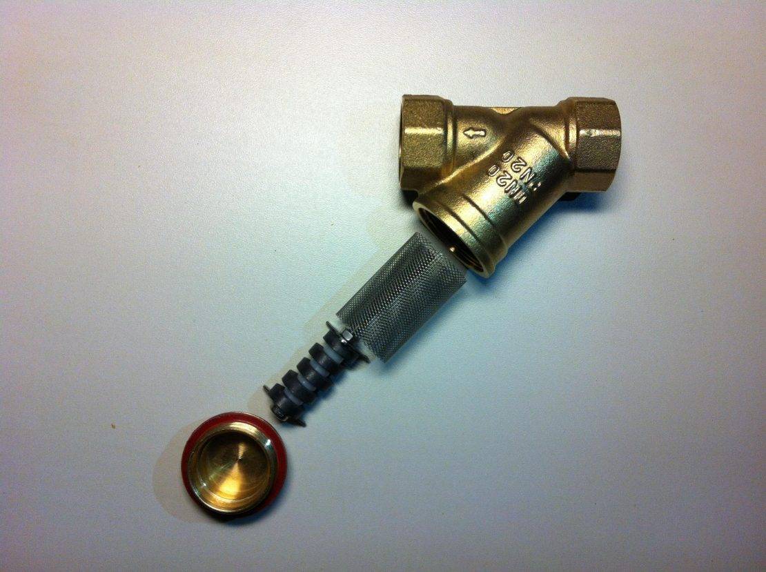 Регулярная прочистка «косого» фильтра особой сложности не представляет. Необходимо просто перекрыть краны подачи теплоносителя с обеих сторон (если за фильтром по ходу течения жидкости установлен обратный клапан, то перекрывать можно только со стороны входа). Затем снизу поставляется емкость для сбора вытекающей жидкости и скопившегося шлама. Гаечным ключом выкручивается пробка, вынимается сетка.