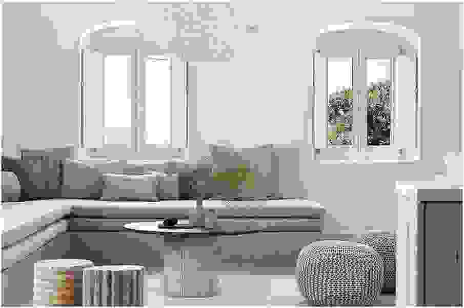 Изюминкой гостиной может стать арочный шкаф, также уюта помещению добавят подушки на подоконниках с принтом в греческом стиле