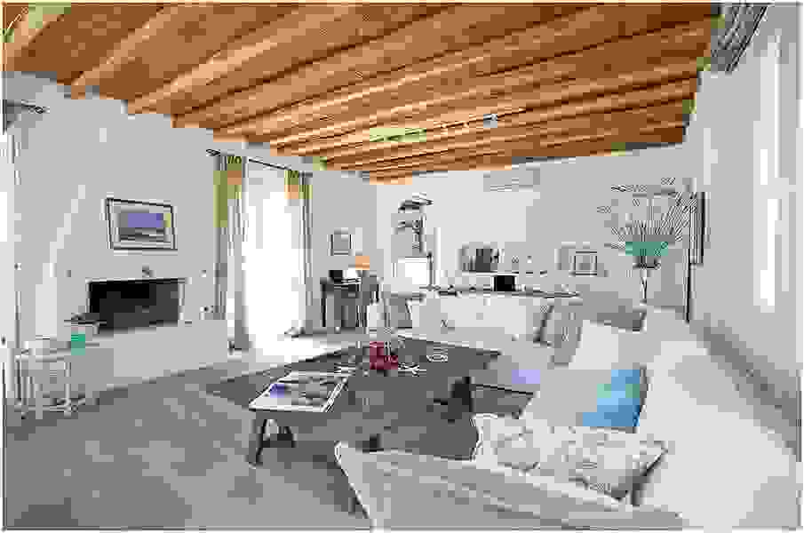 Гостиная с полукруглым диваном и деревянным потолком в греческом стиле
