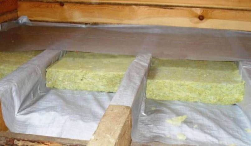 - ШАГ 3. В пространство между балками закладываются маты или плиты минеральной ваты.