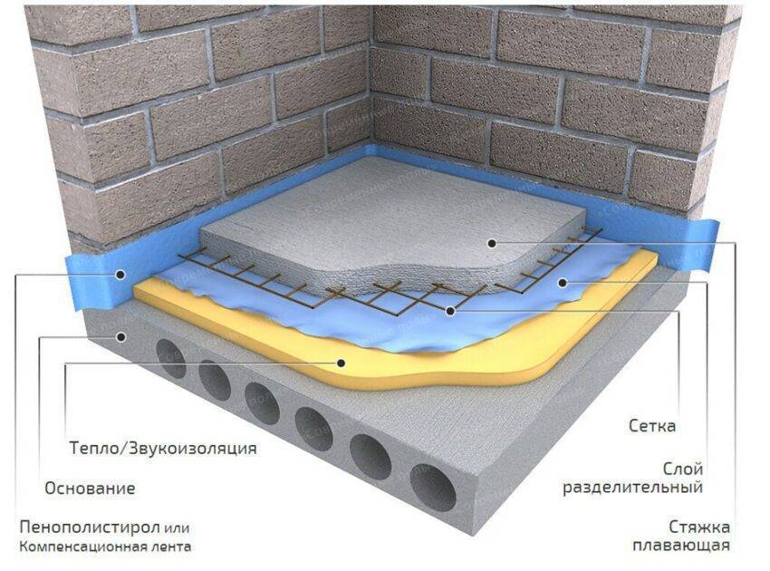 - Полусухая стяжка пола своими руками выполняется в соответствии с технологией «плавающей стяжки» и заключается в следующих этапах: