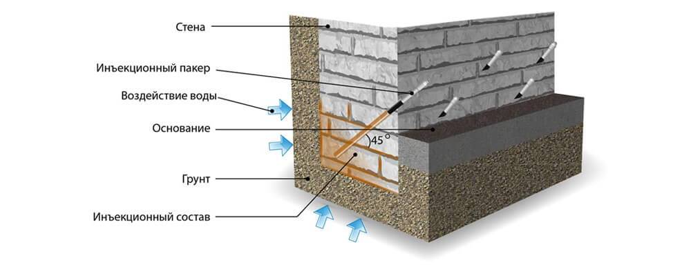 Внутри кладки образуется водонепроницаемый слой. Иногда такие инъекции делаются в фундаменте, иногда в нижней кладке. Отверстия под шпуры бурятся под углом в 45-60°.