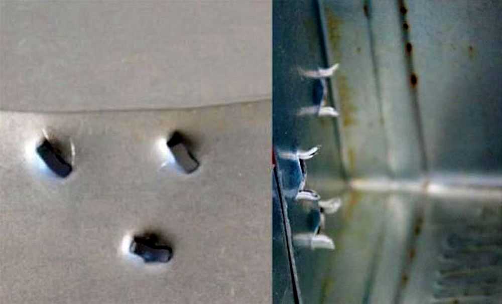 Фото того, как работает просекатель. Он проделывает сквозное отверстие в соединяемых деталях и загибает лепестки из металла
