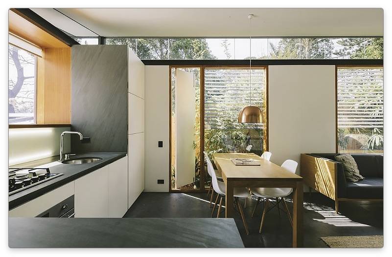 Еще один образец дизайна кухни гостиной в стиле минимализма. Все элементы лаконичны. Нет декоративных аксессуаров. Нет даже ручек на фасадах. Но есть стиль и пара элементов, придающих интерьеру индивидуальность — медная полусфера светильника и поворотная дверь-панель, ведущая из кухни в заросли сада.