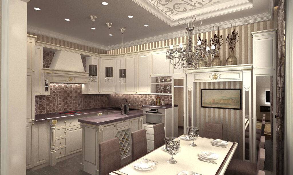 На фото – типичный проект в роскошном стиле: белые обои, гарнитур, фасады с позолотой, белые с золотой отделкой стулья.