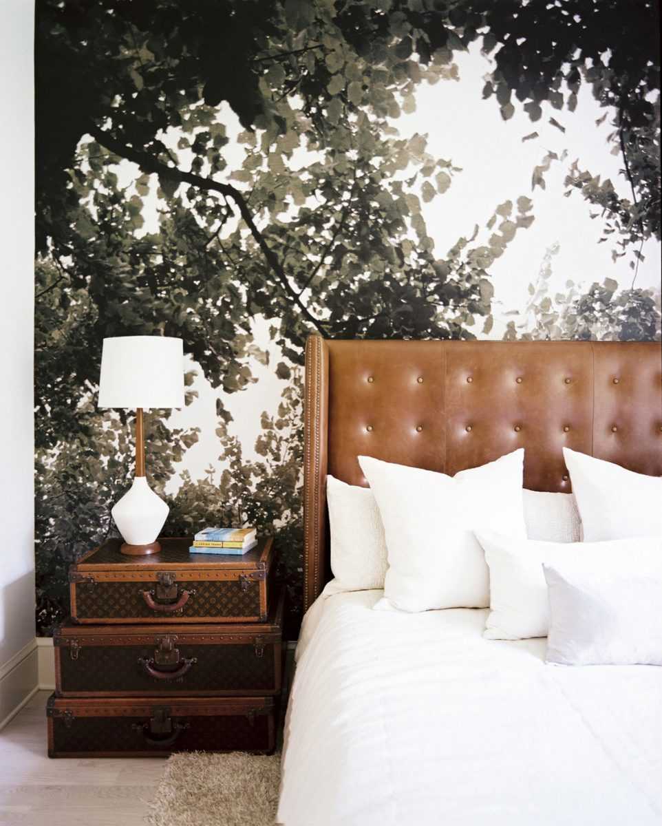 Градиенты и фотообои — ещё один вид обоев неплохо вписывающийся в современные спальни. Но будьте аккуратны с фотообоями — это очень рискованный ход. Такой вариант может выглядеть стильно, а может и колхозно, нужно тонко чувствовать грань. Если умеете работать с графическими редакторами, можете прифотошопить обои в свою спальню, чтобы прикинуть как это будет выглядеть.