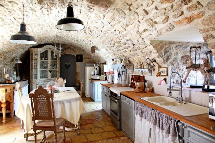 Рекомендация! Чтобы не испортить рельефность кладки, следует избегать фронтального освещения для обработанных зон. Лучше заменить люстру по центру встроенными светильниками.