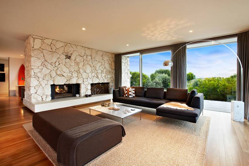 Камень ассоциируется с надежностью и безопасностью. Если он присутствует в гостиной – домочадцы чувствуют себя уверенней, «как за каменной стеной».
