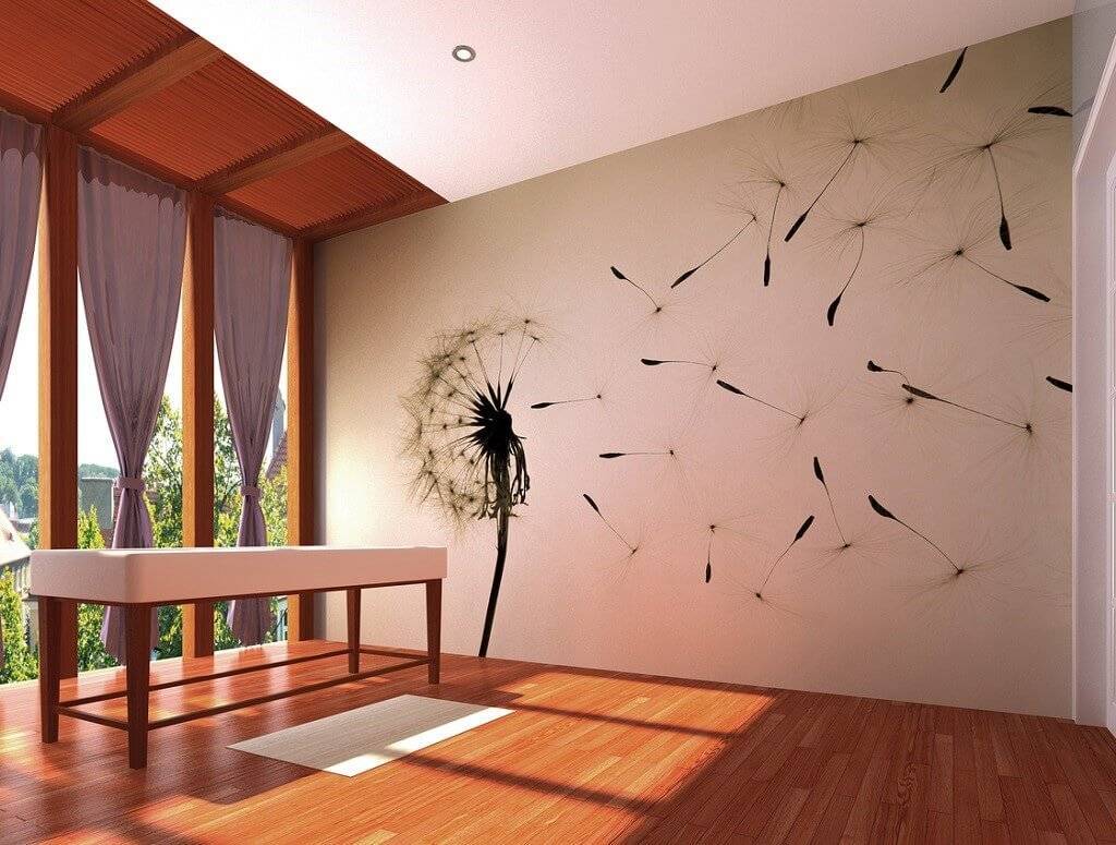 Выбирая палитру отделки нужно учитывать, на какую сторону выходят окна комнаты. Большое количество солнечного света может немного погаснуть, если в помещении будет использовано изображение темного леса или заброшенного грота, морских глубин или чернота космоса. А затененную комнату сделать ярче и светлее помогут фотографии солнечных пейзажей или коллажи из цветов и предметов на белом фоне.