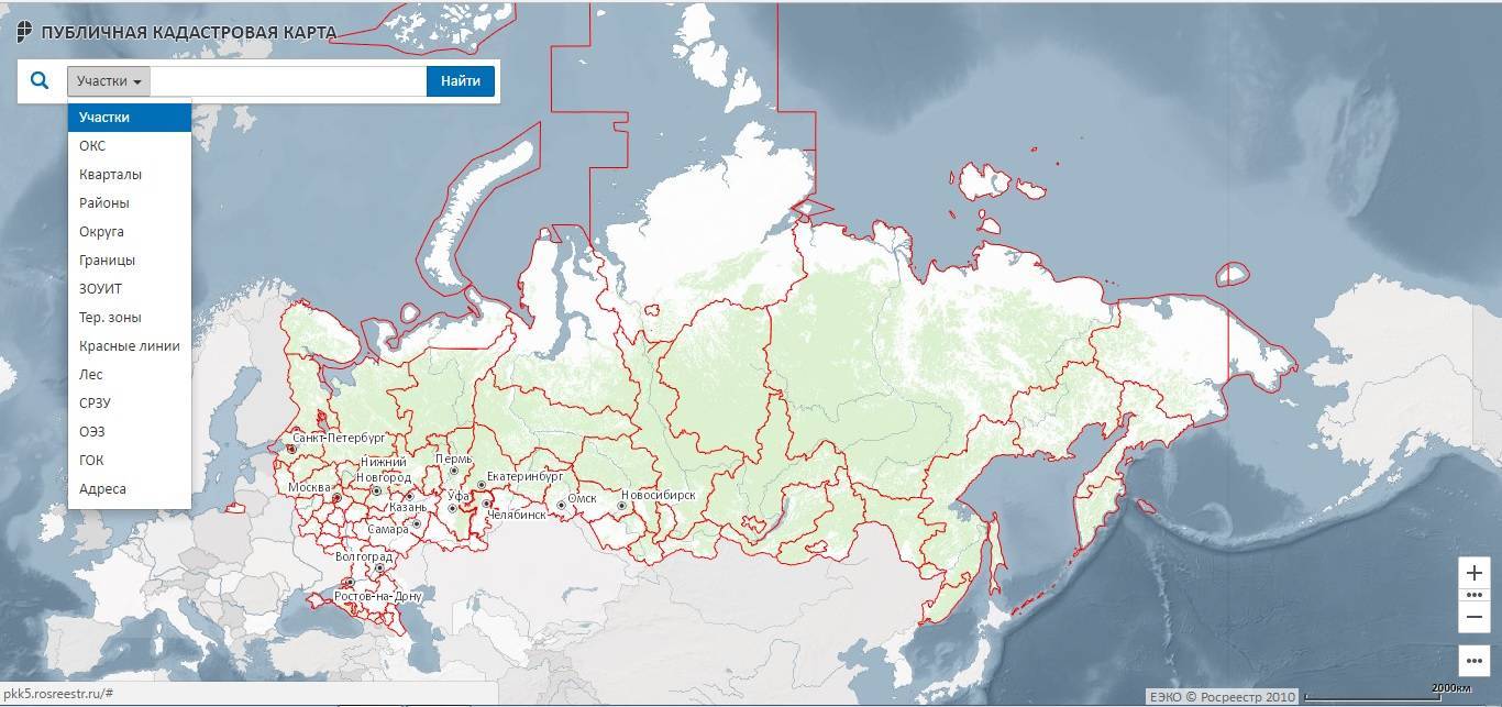 Заходим на сайт, в верхнем левом углу нажимаем на значок «поиск» и выбираем поле «адреса». После чего вводим адрес участка и нажимаем «найти».