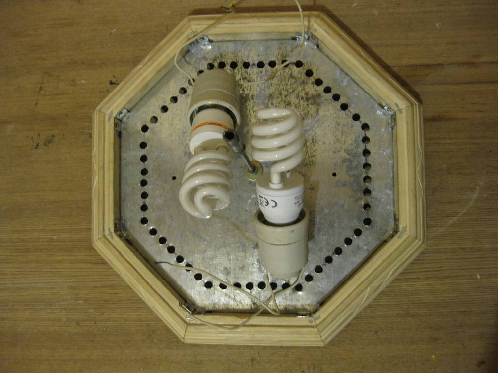 В дощечке, имеющей большую толщину делаем отверстие, устанавливаем пускатель с выключателем и подсоединяем к лампе. Далее на лампу нанизываются диски в необходимом количестве, устанавливаются стойки вокруг дисков и крепится верхняя часть.