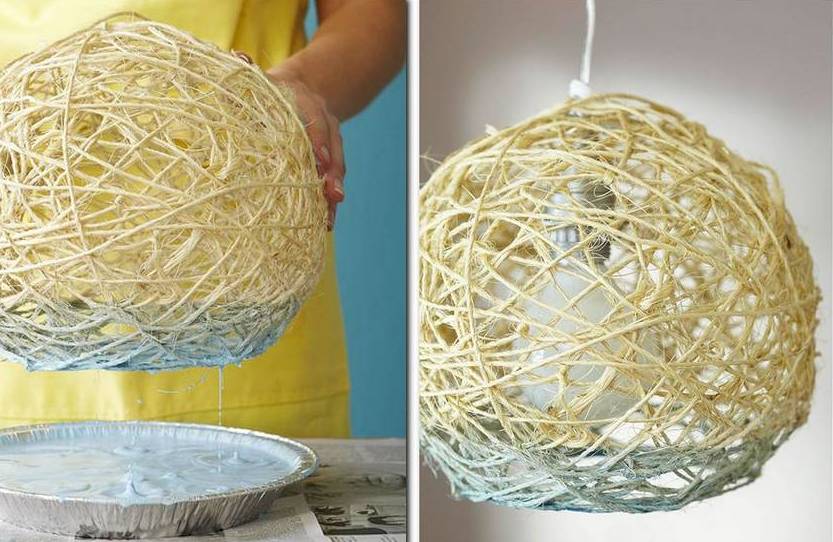 - Надувной шарик и бечевка. Бечевку пропитывают смесью воды, крахмала и клея ПВА. Ею обматывают надутый шар, располагая витки в произвольной форме, и дают высохнуть. Затем из шарика выпускают воздух и аккуратно отделяют его от высохшего шнура. Полученный абажур можно оставить белым или покрасить акриловыми красками.