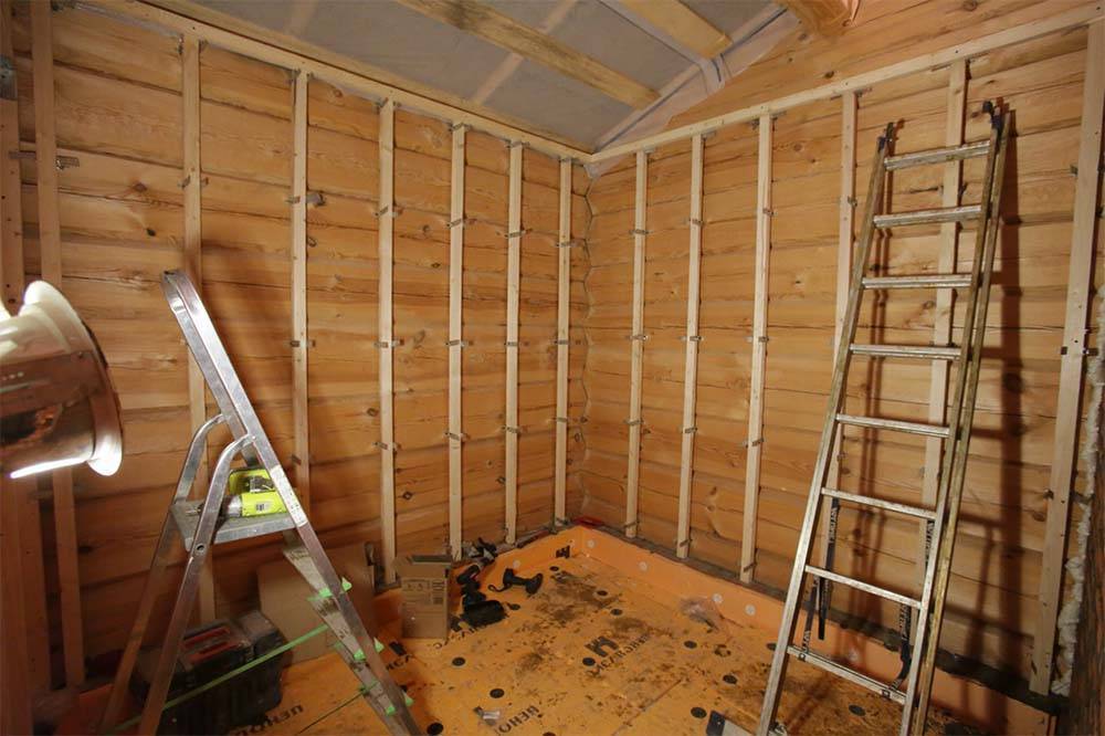 - Если выровнять поверхность не представляется возможным, для монтажа предварительно возводят каркас-основу. Материалом могут выступать деревянные брусья, металлические либо пластиковые рейки.