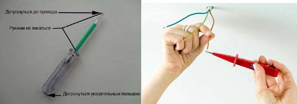 Берем мультиметр и/или индикаторную отвертку. С отверткой работать просто: при прикосновении к фазе загорается светодиод, вмонтированный в корпус. Так что определить фазные проводники будет легко. Если кабель двухжильный, проблем нет — второй проводник это ноль. Но если провод трехжильный, понадобиться мультиметр или тестер — с их помощью определим какой из оставшихся двух фазный, какой — нулевой.