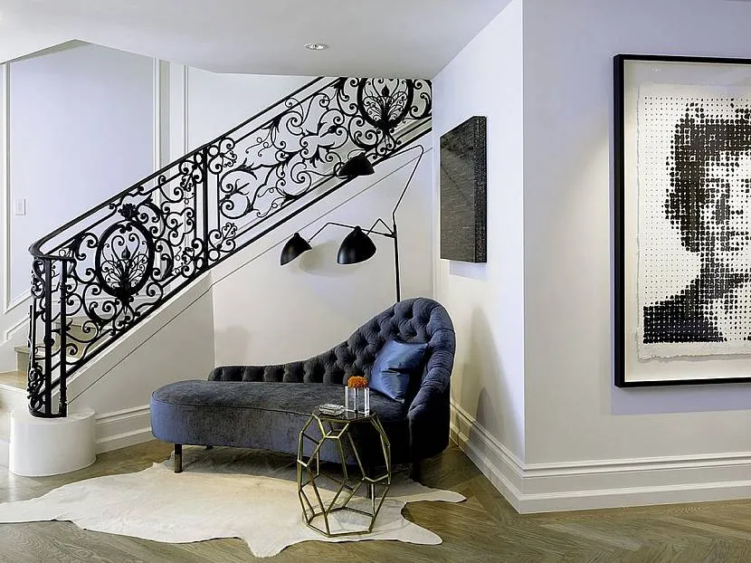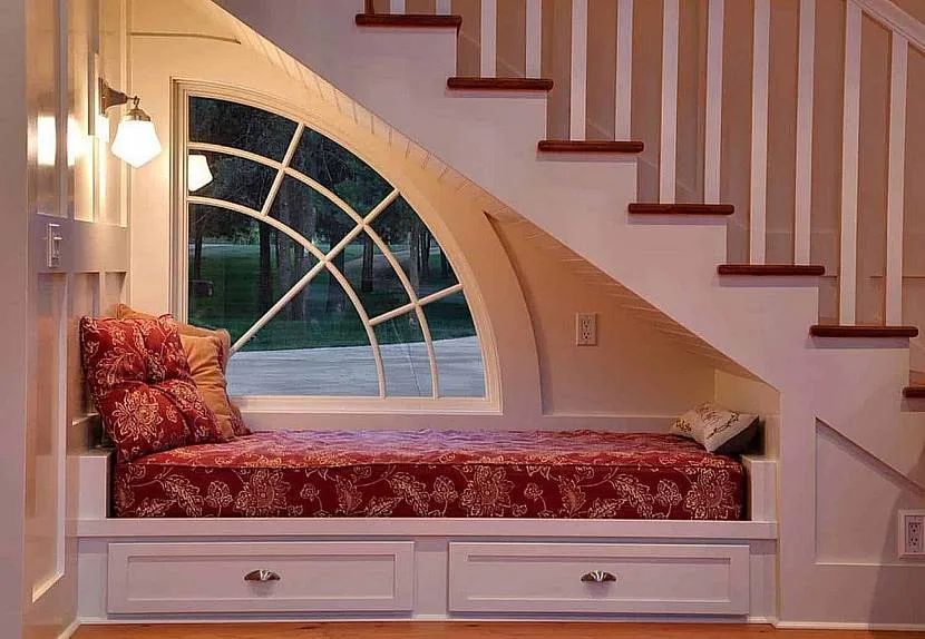 Участок под лестницей дизайнеры рекомендуют обустроить для релакса. В нише располагают кушетку, превращая в лаунж-зону. В помещение проводят электричество, на стенах монтируют стеллажи для книг или рукоделия. Пространство можно сделать открытым или закрытым (занавеска, ширма).