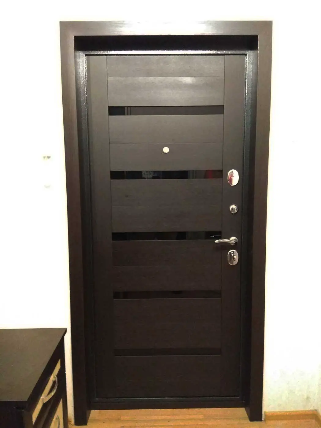 Один из лучших способов облагородить входной проём это — установка доборов на входную дверь. Откосы будут эффектно выглядеть, если правильно подобрать цвет, а наличники будут защищать обои на краях стен от загрязнения руками и от отклеивания. Такое декоративное оформление всегда будет выглядеть стильно, изучайте фото в галерее и вы увидите что это так: