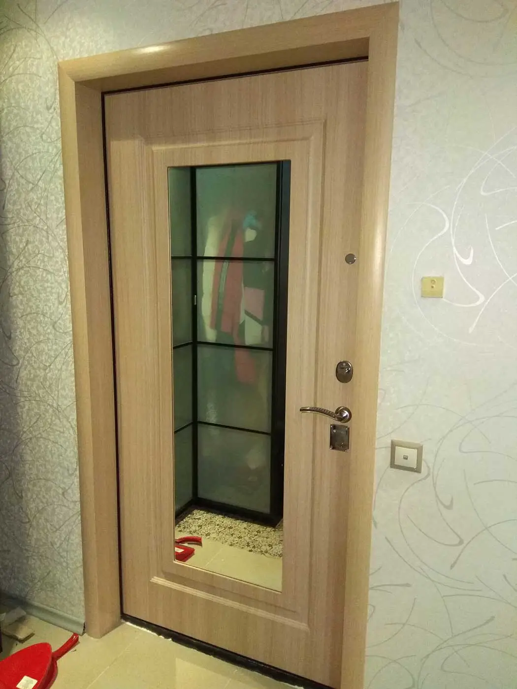 Этот вариант отделки достаточно практичен, он используется для облицовки откосов на входных дверях квартир в многоэтажных домах. Прежде чем приступить к работе, необходимо закрыть дверь полиэтиленом (чтобы не запачкать ее), тщательно прогрунтовать дверной проем, а также подготовить все инструменты и материалы для дальнейшей работы.