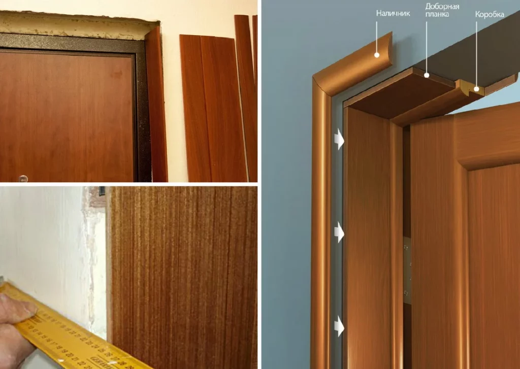 Даже, если известны точные габариты проема, важно проводить контрольные замеры после монтажа двери. Поэтому измеряют длину горизонтальных доборов, а также ширину и высоту вертикальных