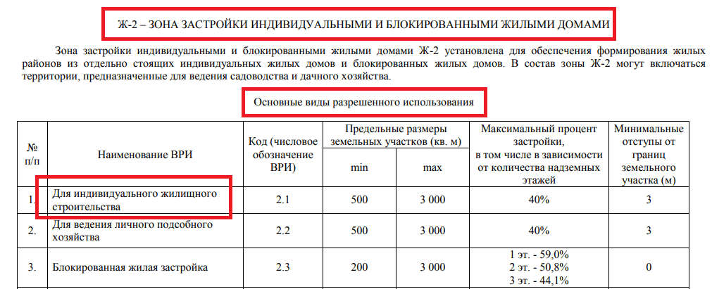 В описании каждой зоны есть таблицы с таким названиями — «Основные виды разрешенного использования» и «Условно разрешенные виды использования». Смотрим в какой из этих таблиц есть ИЖС (для индивидуального жилищного строительства). В моем случае ИЖС был указан как один из Основных видов разрешенного использования.