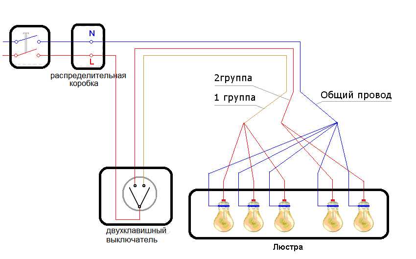 В каждом рожке светильника находится два провода разного цвета. Чтобы правильно повесить люстру и провода подключить к двойному выключателю, нужно их соединить с одной нейтралью и двумя фазами в потолке. Другими словами, необходимо электропровода в светильнике разделить на три группы. Такая схема подключения позволяет зажигать каждой клавишей выключателя определенное количество ламп в осветительном приборе. При этом разбивку проводников на две группы выполняют произвольным образом на свое усмотрение.