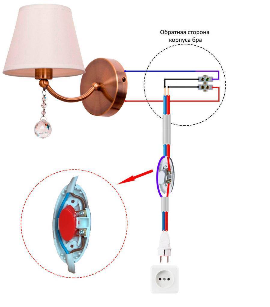 А что делать, когда конструкция бра не позволяет разместить внутри корпуса дополнительный выключатель на цепочке или просто такового нигде нет в наличии?