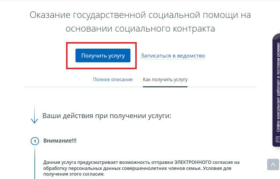 Дальше откроется страница с подробной информацией о том, что предоставляет собой услуга и что для этого требуется. А в правой части экрана расположится кнопка «Получить услугу».