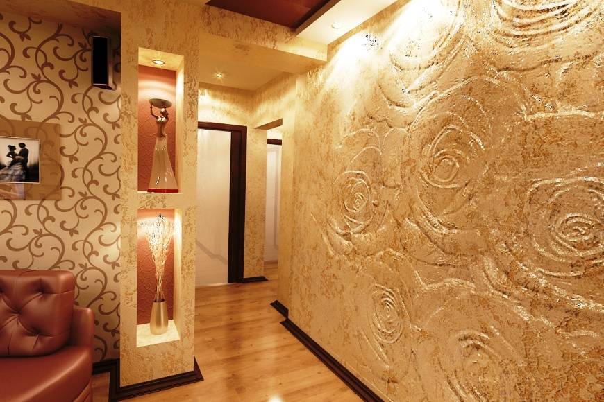 Не ушла в прошлое и венецианская штукатурка с мраморной крошкой. Прозрачная масса с мраморной крошкой продается в виде готового прозрачного состава. Поверхность покрывают лаком или воском.