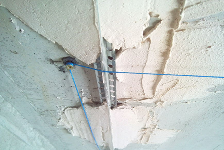 Маяки из пластика не подвержены коррозии, они не требуют выполнения демонтажа после окончания разметки. Когда провес стен выполнен, можно установить ровную планку по шляпкам саморезов, которую следует заменять в отдельных случаях правилом. Этот инструмент используется для заполнения зазора, появившегося между поверхностью и рейкой. После затвердевания перфорированная планка аккуратно снимается, застывший состав используется в качестве направляющей для нанесения штукатурки на поверхность потолка.