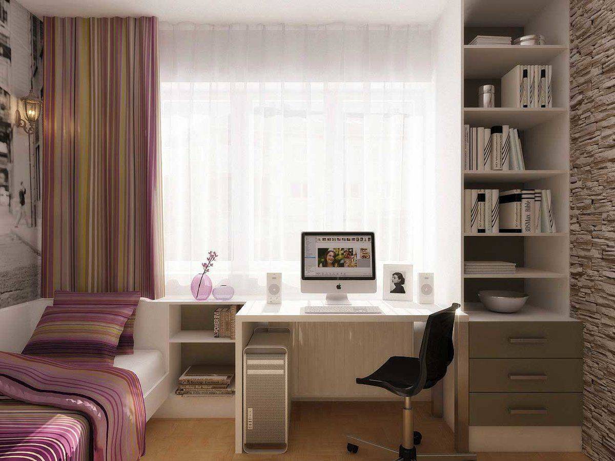 В особо компактных помещениях у окна можно установить кровать. Но если окна выходят на улицу с дорогой, подобный вариант не совсем уместен. При отсутствии хорошей шумоизоляции у стен, во время отдыха вас будет беспокоить уличный шум.