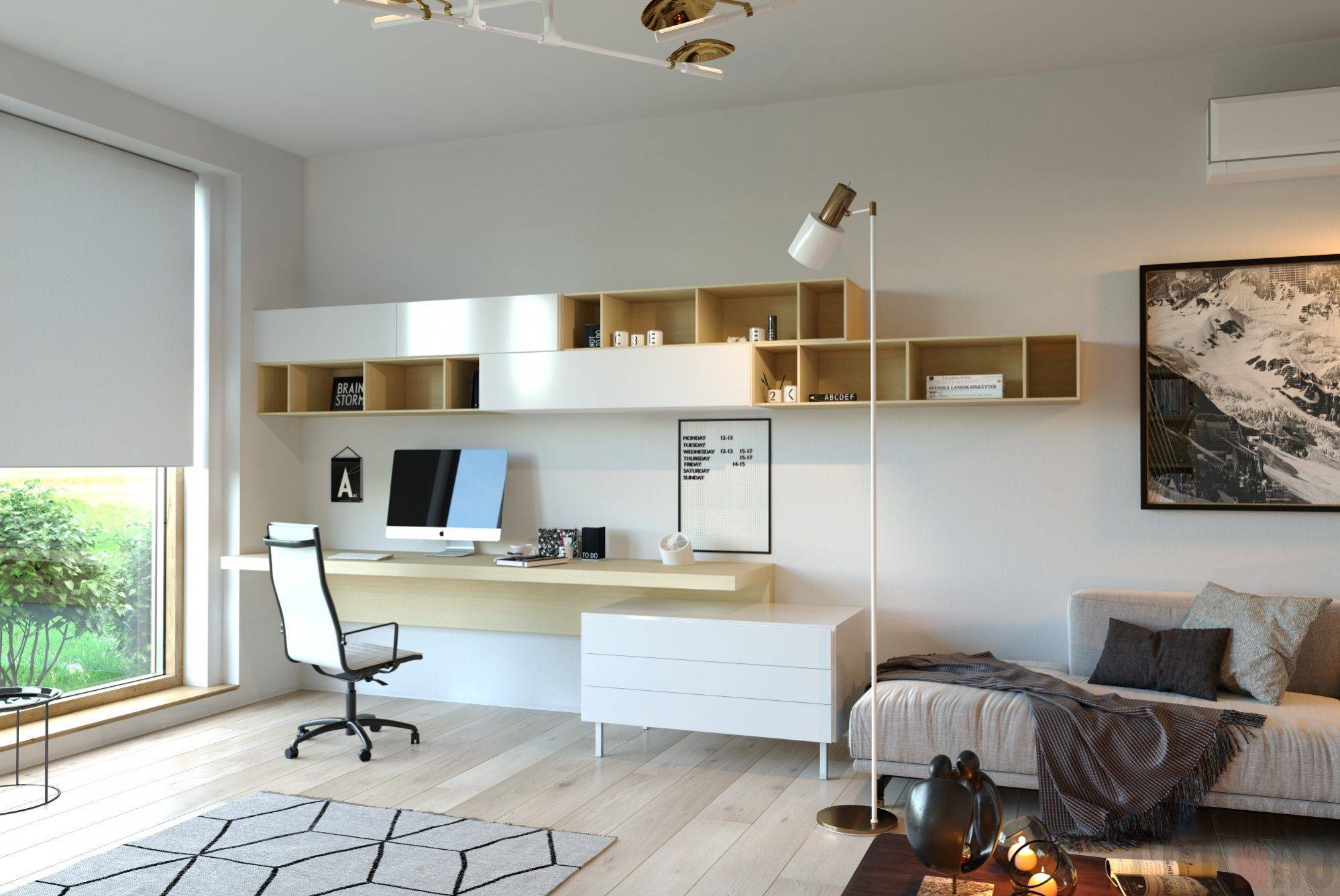 Достаточно стильным и органичным решением является обустройство рабочей зоны совместно со шкафом у окна. Это распространенный вариант планировки в детских комнатах и гостиных. При этом не обязательно устанавливать только полноценный компьютерный стол. Можно использовать одну планку на всю ширину стены, которая будет использоваться в качестве верхней планки для боковых секций нижнего ряда. Подобное оформление выглядит красиво и практично, а также позволяет солнечному свету наполнять пространство.