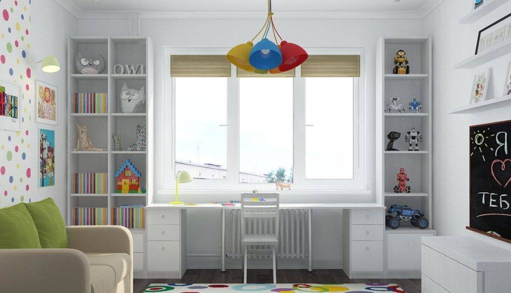 конструкция из шкафов вокруг оконного проема позволит максимально эффективно расположить принадлежности для занятий, игрушки и другие мелочи. Детские шкафы должны быть устроены в соответствии с возрастом ребенка, чтобы он мог легко достать до всех ящиков. К тому же они не должны иметь острых углов и выпадающих частей.