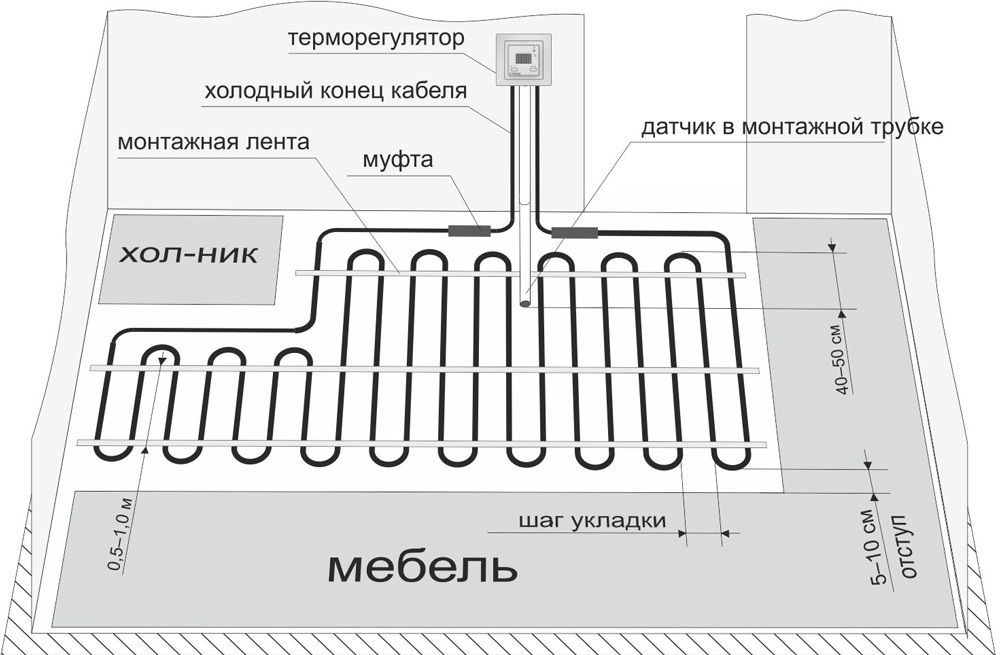 - Самым распространенным способом укладки является «змейка». При такой укладке кабель тянется по всей ширине или длине комнаты, не доходя до стены, заворачивается и прокладывается к противоположной стене, где опять заворачивается. Таким способом покрывается вся отведенная под систему площадь пола. При этом расстояние между параллельно лежащими частям кабеля должна составлять не менее 8 см.