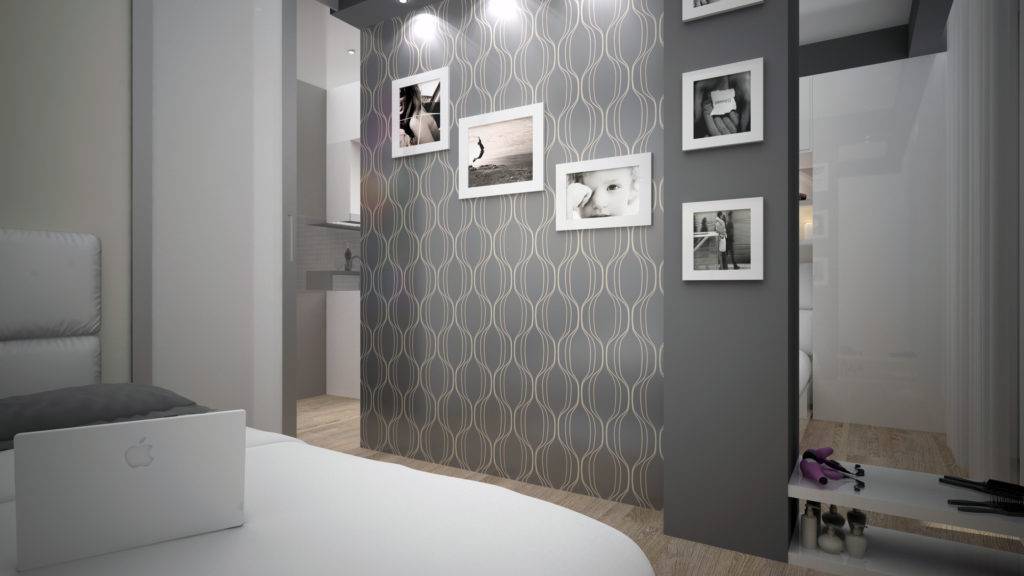 Второй дизайн проект гостиной спальни в одной комнате: перегородка в данном случае высокая, но узкая