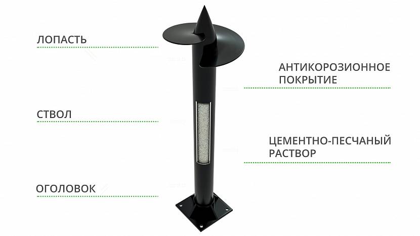 К конусу сваи приваривается гнутая винтовая лопасть, а на сверху свая завершается оголовком из металла.