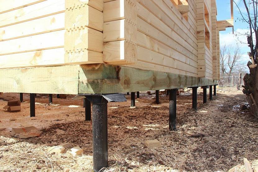 Плоскость основания получилась идеально ровной. Под оголовники для выравнивания бревна ничего лишнего не пришлось подкладывать. Хотя знаю, что многие строительные фирмы промышляют таким вариантом, чтобы исправить свои «косяки» (разный уровень высот в сваях).