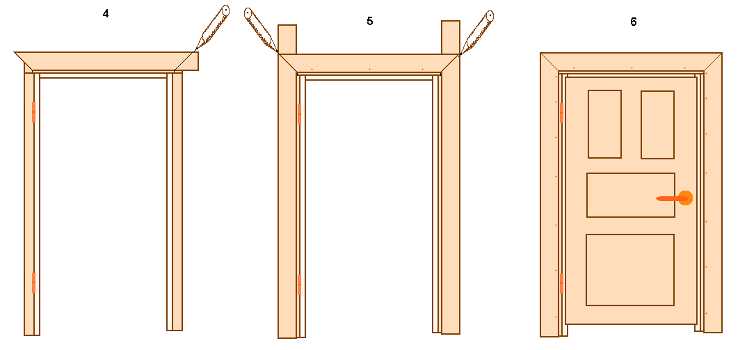 Теперь можно отпиливать своими руками концы притолоки (опять-таки торцовочной пилой либо стуслом). Эта процедура делается под углом в 45°.Далее занимаемся дверными петлями.