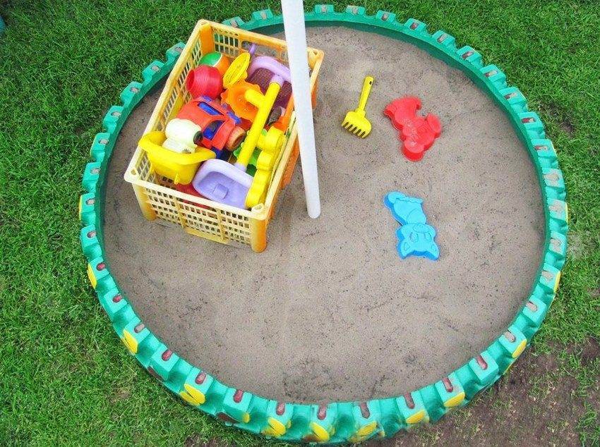 Проще всего из ненужной резины от «большегруза» соорудить небольшую песочницу для одного ребенка. Ее лучше поставить в тени, поскольку «грибок» или навес особо негде расположить. Можно заменить его тканевым тентом или старым пляжным зонтиком, меняя местоположение в зависимости от тени.