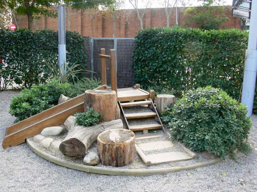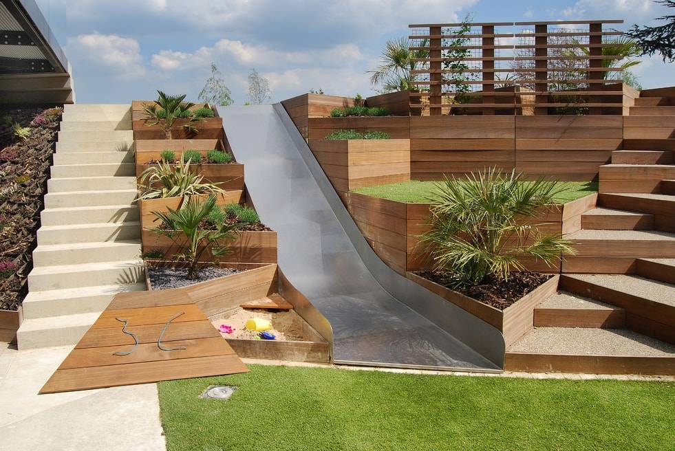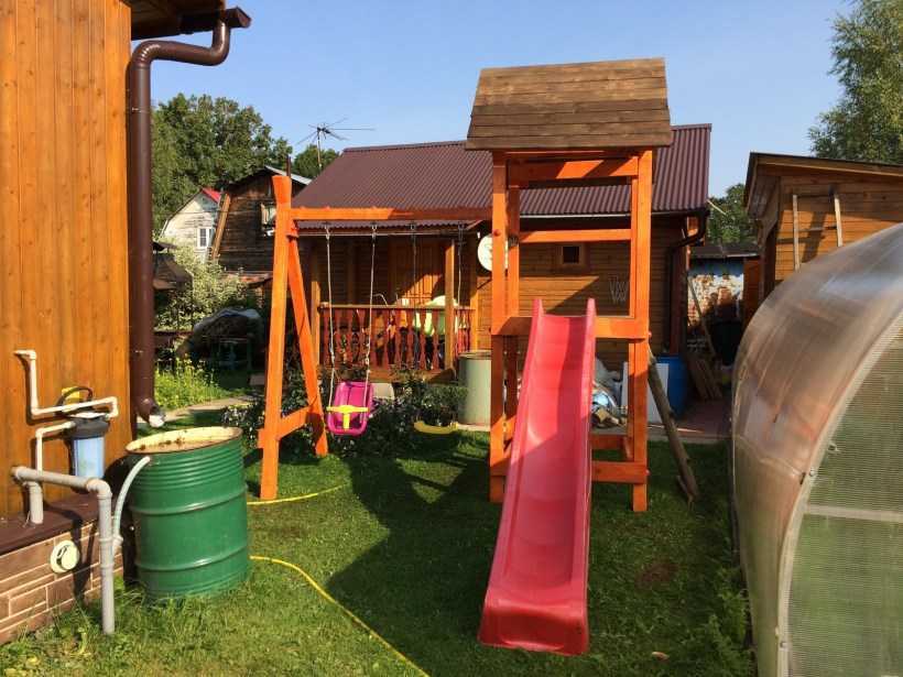 Горку удобно устраивать из готовых деревянных или пластиковых деталей, которые должны быть разноцветными. А если одного спуска недостаточно, то к горке крепится перекладина для качелей и лестницы, идущей под острым наклоном. Часто детская площадка во дворе своими руками располагает горкой, которая пристроена к беседке.