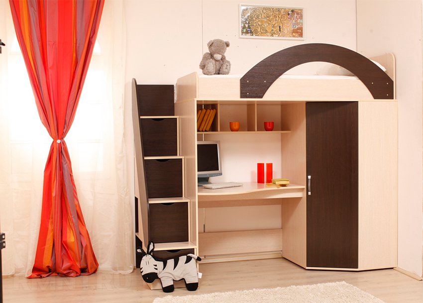 Для этого оптимально подойдет выдвижная версия спального места. Подобная модель максимально комфортна и безопасна для обустройства детской комнаты. По высоте спальное место берется чуть более 700 мм. В дневное время нижняя часть прячется в нишу, освобождая пространство для занятий и игр. Особенность данной конструкции, что оба элемента не закреплены между собой, а это позволяет использовать их по отдельности.