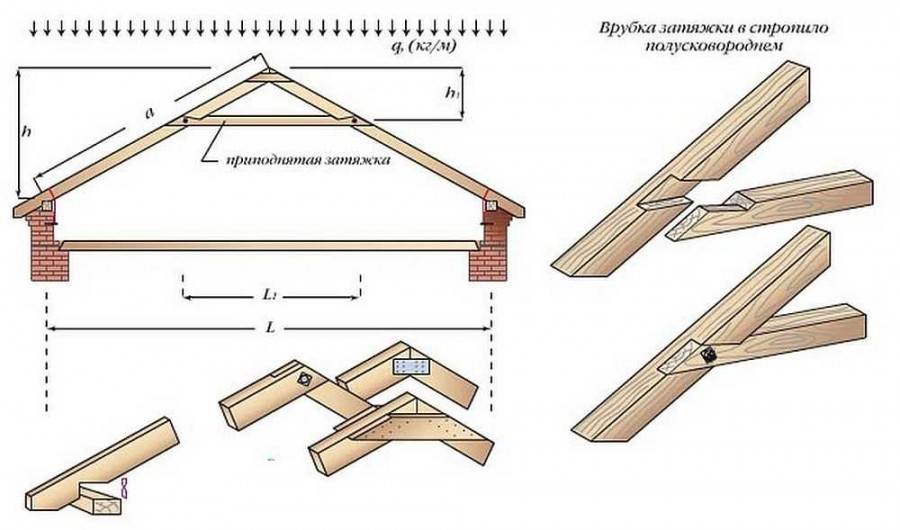 Примечание. Далеко не в каждой постройке применяются все указанные детали. Бывают простые конструкции, состоящие только из мауэрлата, стропил и затяжек. Мы рассмотрим их далее.