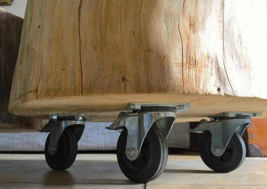 - Удобным решением будет использование мебельных колёсиков в качестве ножек. Стол из поддонов получается тяжёлым, а такая конструкция позволит легко передвинуть его. Колёсики должны иметь высокую грузоподъёмность и тормоза.