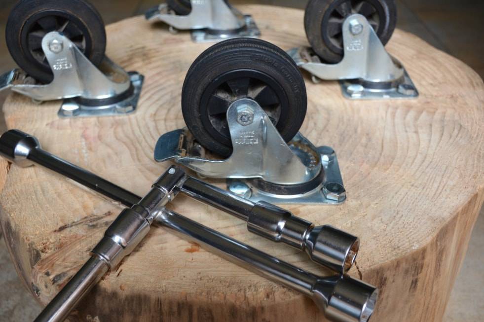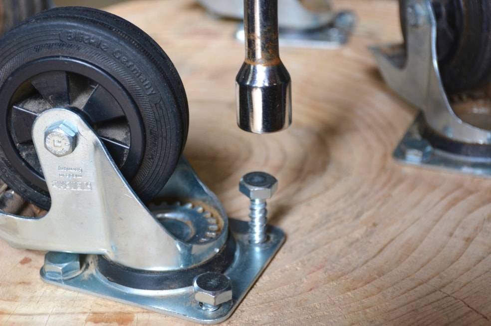 Распределяем колесики и все шурупы. После этого закрепляем каждый из них с помощью гаечного ключа.