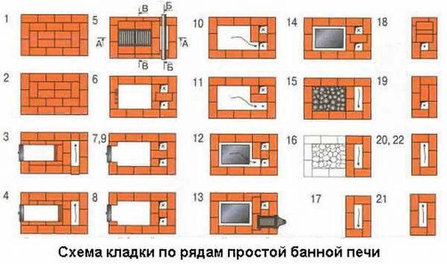 Этот вариант (см. порядовку на рис. ниже), является одним из самых экономичных по стоимости материалов, так как данная печь, будет очень маленькой, но от этого она ни сколько не потеряет своих тепловых качеств. Она будет верой и правдой служить Вам долгие годы, будет быстро нагреваться и нагревать помещение, а маленькие размеры, позволят сэкономить место в бане.